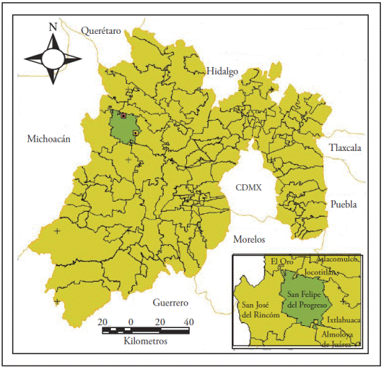 The municipality of San Felipe del Progreso is located in the northwest of Estado de México and is the second in territorial extension within the state, with a surface of 856.05 km2 (Gobierno del Estado de México, 2005). Castillo Nonato and Chávez Mejía (2013) mention that the ejidos of San Pedro el Alto (SPA) and San Pablo Tlalchichilpa (SPT) are located, respectively, in the northwest and southeast part of the municipality, with SPA at an altitude of 2550 m and SPT at 2750 m.