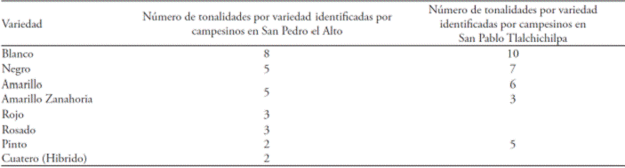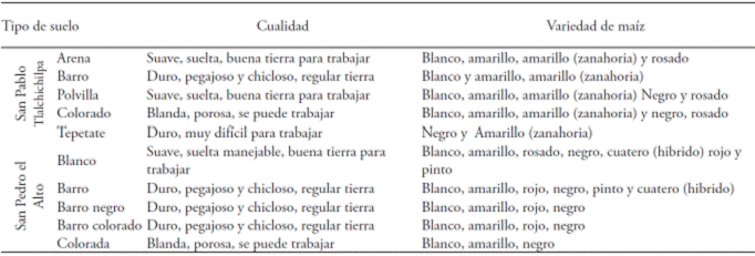 Sowing of maize and its varieties carried out by peasants in the ejidos of San Pedro el Alto and San Pablo Tlalchichilpa, in function of the type of soil, is shown in Table 3.