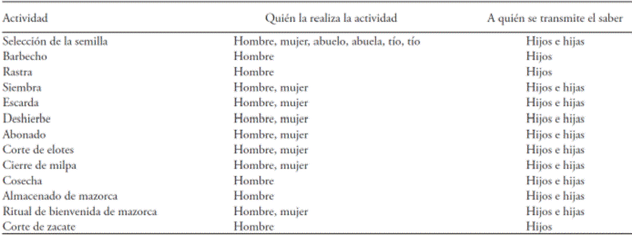 In both ejidos the selection of the seed is a priority activity that is performed by the women (in 70 % of the cases), who get help from their daughters and sons. With regard to the transmission of local knowledge to select the seed, 30 % of the men refer that the knowledge for the selection of seed was transmitted by the mother, followed by the father, grandfather and finally by an uncle or another family member. Table 5 shows who performs each agricultural task and to whom it is transmitted.
