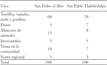 The closing of the cultivation cycle is marked by the cutting of zacate, fodder which is used to feed the animals. The cutting is carried out during the month of December, and it is an entirely masculine task, performed in a morning schedule that covers from 6:00 to 11:00 hours. The task within this schedule responds to two factors, one because in this period the sunrays are not as intense and therefore the fatigue is less, and because the zacate can be cut more easily because it has the moisture from the morning dew; otherwise, later, the sunrays make the plant brittle, making cutting zacate more difficult. Table 7 shows the main uses of maize by peasant men and women (100 per community).