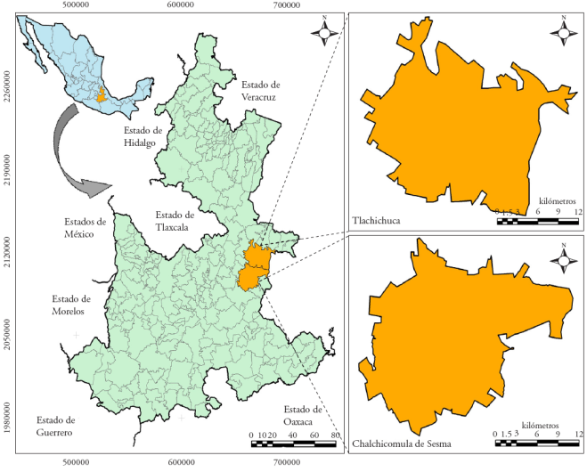 The study was carried out in the municipalities of Chalchicomula de Sesma and Tlachichuca (Figure 1). The first municipality is located between parallels 18° 52’ and 19° 05’ of latitude north and meridians 97° 16’ and 97° 34’ of longitude west; the second is located between parallels 19° 02’ and 19° 16’ of latitude north and meridians 97° 12’ and 97° 30’ of longitude west. The land use destined to agriculture occupies 79%; the urban zone, 3%; the forest, 14 %; the grasslands, 3 %; and the shrubs, 1 % (INAFED, 2010). In Tlachichuca, the land use and vegetation corresponds to agriculture (49.53 %) and urban zone (0.57 %), forest (35.75%), grassland (7.64%) and scrubland (4.35 %) (INEGI, 2010).