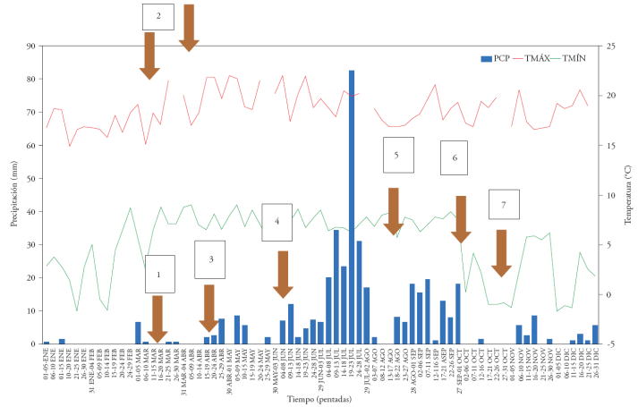 The year of 1987 is considered as regular for the saying “Dry times in March mean rains in May”, while in the case of: “Water in May, bread for the whole year”, rain accumulation of 6.5 mm was observed in the first pentad of March 2 to 6, and total precipitation in the month of 8.0 mm, which represents rain scarcity. According to the saying, it was expected for there to be rain in May; however, it was not so. During May it rained a total of 16 mm, with the second and third pentad standing out, with 8.5 and 5.5 mm. The saying “Heat in early March is quite healthy for the country” was not fulfilled, although two maximum temperatures were present during the first date of March 2-6, with a temperature of 19.1 and the fifth pentad with 21.5 °C. In the case of “Rain in April, grains in the thousands”, it was not fulfilled since there was no rain scarcity during the month of April and an increase of 7.5 mm was observed during the sixth pentad, with total precipitation in the month of 12 mm. For “If Winter becomes Summer, Summer becomes Winter”, in the summer of June-July-August there were not conditions that showed hours of cold /frosts. With regards to the saying that includes water, there was a positive trend of accumulation per pentad. However, starting from the first pentad of the month of August, a decrease in rainfall of 17 mm was present, with a total of 29.5 mm. For “In September, either the fountains dry up or the bridges overflow”, another event was present, which is the midsummer heat or partial suspension of rainfall in the midst of summer; in this case it can be catalogued as “Dry midsummer heat” and during the month of September there was scarcity of rainfall- 80.5 mm. In the case of the proverb “El Cordonazo de San Francisco”, it coincides with the pentad from October 3 to 7; the first “agronomic” frost was present with a minimum temperature of 0.2 °C. For this year, two of the seven proverbs were fulfilled (Figure 3).