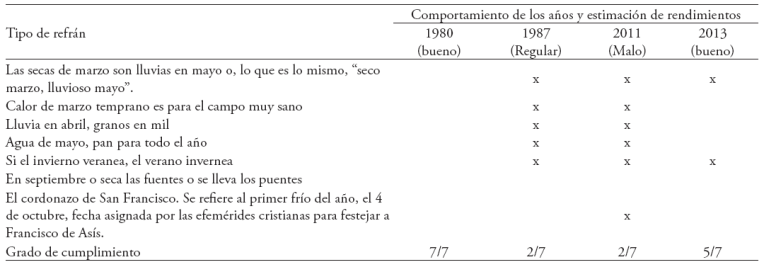 There is partial agreement of the knowledge of maize producers with regards to the natural variability of the climate. In years with good yields, the highest number of proverbs that those surveyed mentioned was fulfilled, as in the case of 1980 and 2013, in contrast to the regular year (1987) and the bad year (2011). The weather is a changing system where the distribution of precipitation for the agricultural sector represents one of the variables that require specialized monitoring, due to the different scales at which rainfall is present. The fact that some proverbs were not fulfilled in this study is due to events of greater scale or to the interaction of more than two processes. The producers from those communities affirm that in the last 10 years the climate is uncertain and most cannot be fulfilled.