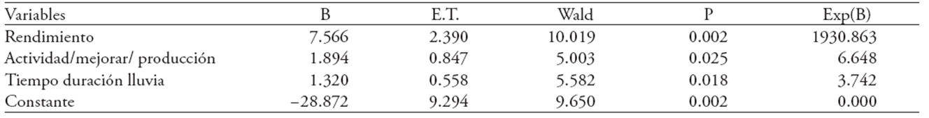The proverbs that the farmers said are least fulfilled were present primarily in the bad year (2011) and the regular year (1987), and they were: “Dry times in March mean rains in May”, in other words, “dry March, rainy May”. “Heat in early March is quite healthy for the country”. “Rain in April, grains in the thousands”. “Water in May, bread for the whole year” and “If Winter becomes Summer, Summer becomes Winter” (Table 1). To understand what are the factors related to the acceptance or lack of acceptance of the sayings, according to the logistic regression model applied to a group of different social, economic and agronomic variables of maize producers in the municipalities of study, after a process of variable selection it was found that the yield, the practices that the farmers carry out to improve maize production, and the time that rainfall lasts in minutes, were significant (Table 2); that is, that there is an association between the yield, performing productive practices, and rainfall with the acceptance or lack of acceptance of the proverbs.