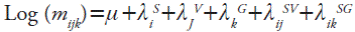 donde µ: representa la media general, m ijk : denota las probabilidades multinomiales correspondientes de la celdas para i= 1, 2, j=1, 2 y k=1, 2, 3. λ S : denota la aplicación de fuentes de adquisición de información (i=sí o no); λ V : denota los pueblos estudiados (j=Chacksinkin y Cuauhtémoc); λ G : representa el nivel de habilidades del grupo (k=nivel de habilidad bajo, medio y alto). Las interacciones ya sea entre V y G (λ jK VG ) o entre S, V y G (λ ijk SVG ) no fueron significativas, por lo que fueron eliminadas del modelo estadístico final.