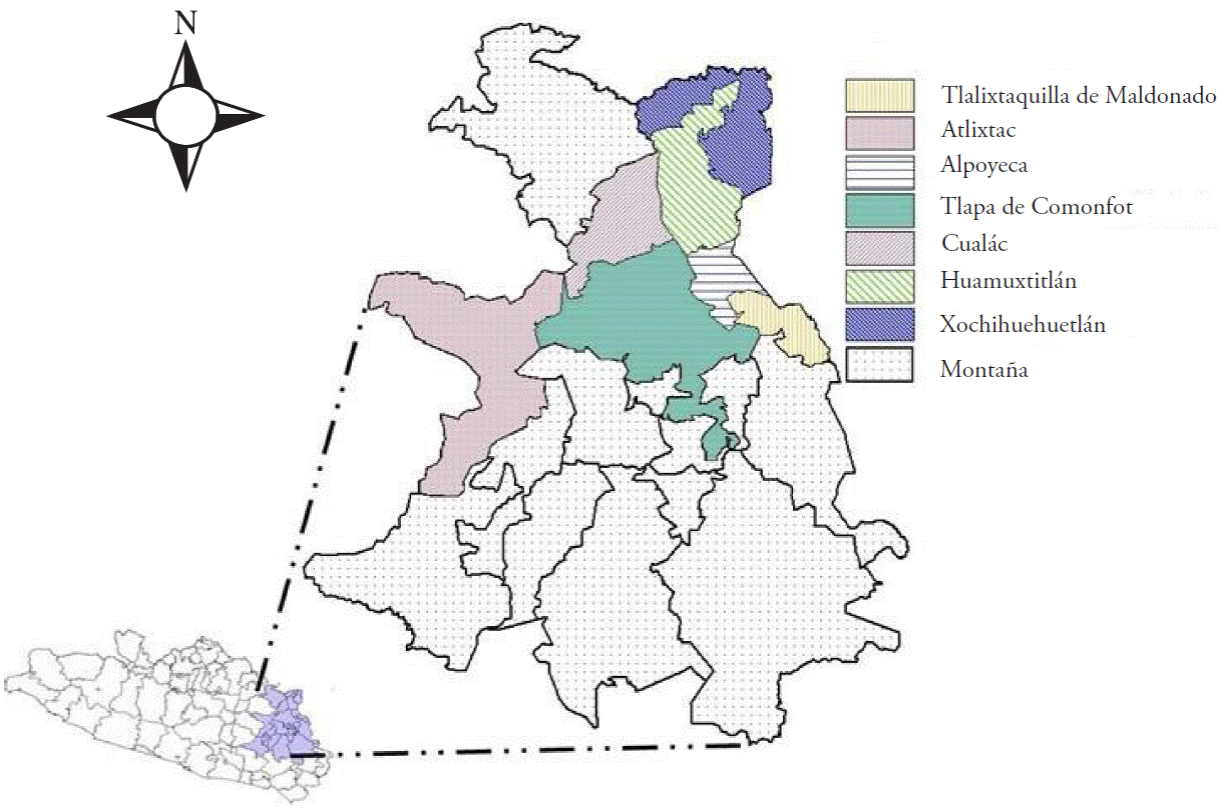 The municipalities where the study took place were: Alpoyeca, Atlixtac, Cualác, Huamuxtitlán, Tlalixtaquilla, Tlapa and Xochihuehuetlán (Figure 1).
