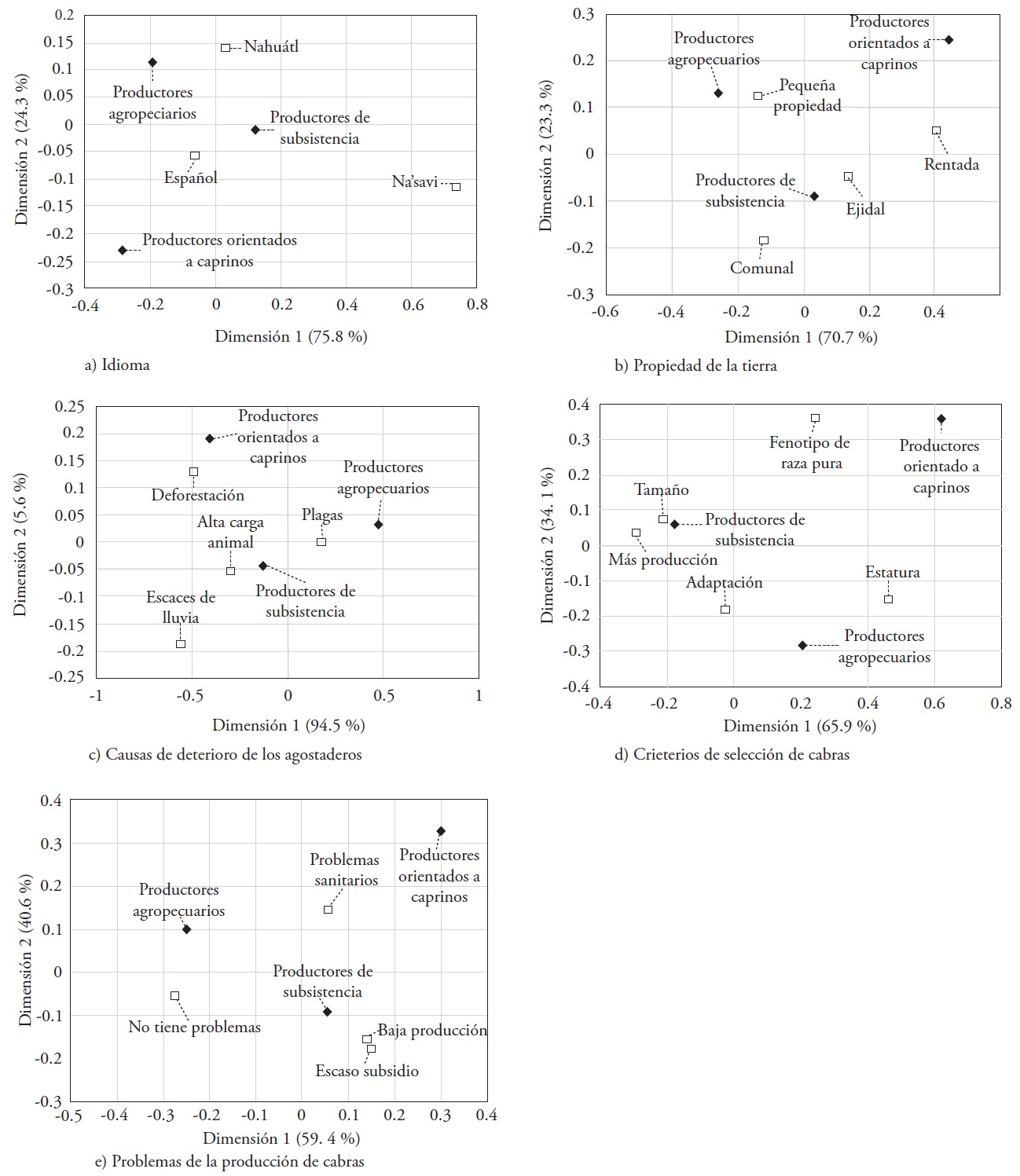 The producers speak mainly Spanish (72.3 %) and local languages such as Náhuatl and Na´savi. The analysis of simple correspondence indicates that the producers aimed at goats (Group 1) are Spanish speakers, while groups 2 and 3 speak Spanish and Náhuatl (Figure 2a).
