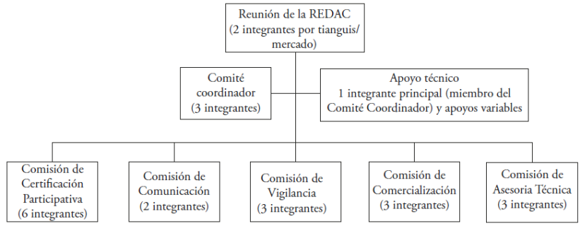 The Mexican Network of Street and Organic Markets (Red Mexicana de Tianguis y Mercados Orgánicos REDAC) was created in 2004. It was constituted legally in 2008 with the objective of gaining access to financial resources for its development. It is a civil society group, integrated by street markets and local and regional organic markets of small-scale or medium-scale producers, consumers and promoters. From 2004 to 2010 the REDAC had the financial support of the Falls Brook Centre NGO from Canada; this allowed covering the expenses of two to three meetings per year, paying for two representatives per market or tianguis, food, lodgings and transport expenses; in addition, the expenses for promotion and outreach were also covered. During 2010 and 2011 financing was secured from SAGARPA to support the Participative Certification (Certificación Participativa, CP); with this, training workshops were organized around production and certification, as well as outreach materials. It should be highlighted that currently the network does not receive direct economic contributions from members of the organic and street markets (Schwentesius et al., 2013).