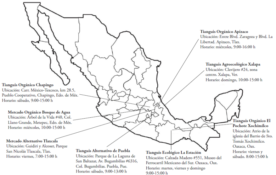 Another one of the initiatives of tianguis and organic markets in Mexico is the Tlaxcala Alternative Market. The meetings for its creation began in 2003; however, the market began activities in 2005. Its aim was the promotion of a culture of responsible consumption and agroecological production in its social, economic, environmental and cultural aspects. The development of this market took place with the participation of Ana Elena Caballero (coordinator of the project), organizations like Proyecto de Desarrollo Integral Vicente Guerrero A.C., Centro Campesino para el Desarrollo Sustentable A.C., Casa de Promoción Social Presentación de Tlaxcala and Herbario de Tlaxcala. Among other actors, the following: Dr. Rita Schwentesius, Dr. Manuel Ángel Gómez Cruz, and M.Sc. Laura Gómez Tovar, who provided advice in the process; Mr. Santiago Martini, Mrs. Ofelia Cova Juárez and Dr. Jürgens (with support in cooperative principles, promotion and productive processes, respectively) (García, 2015).