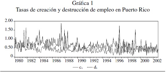 Según la Gráfica 1, tanto la tasa de creación empleo como la tasa de destrucción de empleo muestran una alta volatilidad. La variable ct alcanzó su punto máximo en junio de 1987, mientras que su valor mínimo fue para diciembre de 2000. La variable dt alcanzó su punto máximo en noviembre de 1981 y su punto mínimo para octubre de 1998. Es importante destacar que en el periodo que dt alcanzó su punto máximo hubo una recesión tanto en Puerto Rico como en Estados Unidos.