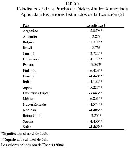 Finalmente, la Tabla 2 muestra los estadísticos t de las pruebas de DickeyFuller aumentado (DFA) aplicadas a los errores estimados de la ecuación (2) por cada país j, f jt