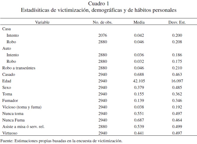 El análisis descriptivo de los datos es siempre interesante en sí. No obstante, en aras de ahorrar tiempo, presentamos sólo una de las muchas tablas que elaboramos. El Cuadro 1 muestra ciertas características de la muestra. La evidencia muestra que afortunadamente para muchos de los entrevistados (y desafortunadamente para nosotros) son pocos los que han sido víctimas de los delitos. Los estadísticos descriptivos muestran que hay más casados y mujeres que solteros y hombres respectivamente. Así mismo, es posible inferir que los viciosos son minoría (menos de 4 por ciento), mientras que los virtuosos constituyen el 44 por ciento de la muestra.