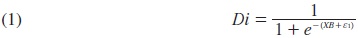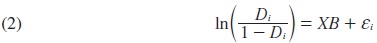 La ecuación 2 no puede ser estimada a través de mínimos cuadrados ordinarios. Sin embargo, se puede emplear la técnica de máxima verosimilitud para estimar los coeficientes pertenecientes al vector B. El modelo logit tiene una ventaja muy importante sobre el modelo de probabilidad lineal, y es que las probabilidades estimadas por el primero no pueden estar fuera del rango de 0 a 1, en tanto que las probabilidades estimadas por el segundo sí pueden salirse del rango en cuestión (Green 2000). Note, sin embargo, que en la ecuación 2, la variable explicada no es Du sino el logaritmo natural de Di/(1-Di), de tal forma que es necesario transformar los coeficientes para que éstos puedan ser interpretados como un cambio en la probabilidad de la variable dependiente.2
