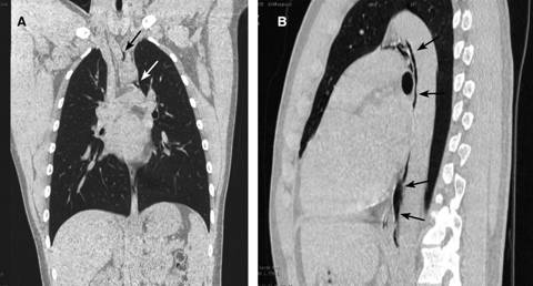 Figura 2: Imágenes de tomografía computada en plano coronal (A) y sagital (B), con presencia de gas entre el tronco braquiocefálico y emergencia de carótida común izquierda (flechas), así como en la ventana aortopulmonar; se extiende caudalmente en íntimo contacto con la aorta descendente (flechas).