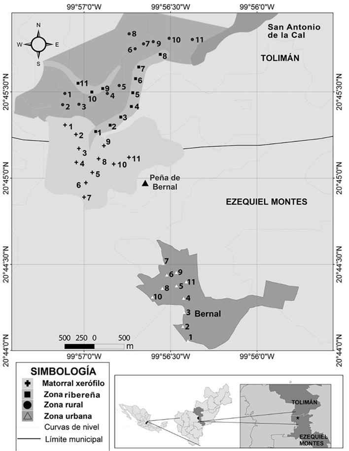 Para realizar el estudio elegimos los siguientes cuatro­ ambientes: 1) Matorral xerófilo, en la ladera norte del monolito. El estrato superior en este sitio no rebasa los 4 m de altura, y está dominado por Prosopis laevigata, Acacia farnesiana, A. shaffneri, Myrtillocactus geometrizans; además están presentes algunos elementos de selva baja caducifolia, como Bursera fagaroides y Celtis caudata. En su estrato medio se encuentran algunas especies arbustivas como Zaluziana au­ gusta, Karwinskia humboldtiana y Mimosa biuncifera (Zamudio et al. 1992). En este ambiente, al ser una propiedad privada con uso recreativo, sólo existen algunas veredas con acceso limitado y no hay actividades agropecuarias, edificaciones ni paso de vehículos automotores, 2) Ambiente ribereño en San Antonio de la Cal. Es un cauce estacional con árboles y arbustos nativos del área como Prosopis sp., Acacia sp., Ipomoea sp., Opuntia sp., e introducidos como Schinus molle y Eucalyptus sp. Este sitio colinda con algunas edificaciones distanciadas entre sí, algunas veredas, áreas de cultivo y áreas con vegetación seminatural, 3) Ambiente rural de San Antonio de la Cal. Presenta edificaciones separadas entre sí de manera irregular, las cuales representan menos del 10% del área de un paisaje ocupado mayormente por huertos, áreas agropecuarias,­ caminos de terracería, bardas vegetales y de piedra, remanentes de vegetación nativa, vegetación exótica (plantas ornamentales, Eucalyptus sp.), cableado escaso y presencia humana moderada y 4) Ambiente urbano en Bernal, presenta más del 80% de su superficie con edificaciones y calles pavimentadas con cableado. Este sitio también presenta algunos terrenos baldíos, escasa vegetación nativa, árboles principalmente exóticos (como Eucalyptus sp. y Ficus benjamina), algunos huertos de traspatio, así como constante afluencia de vehículos y frecuente presencia humana al ser esta ciudad un destino turístico importante.