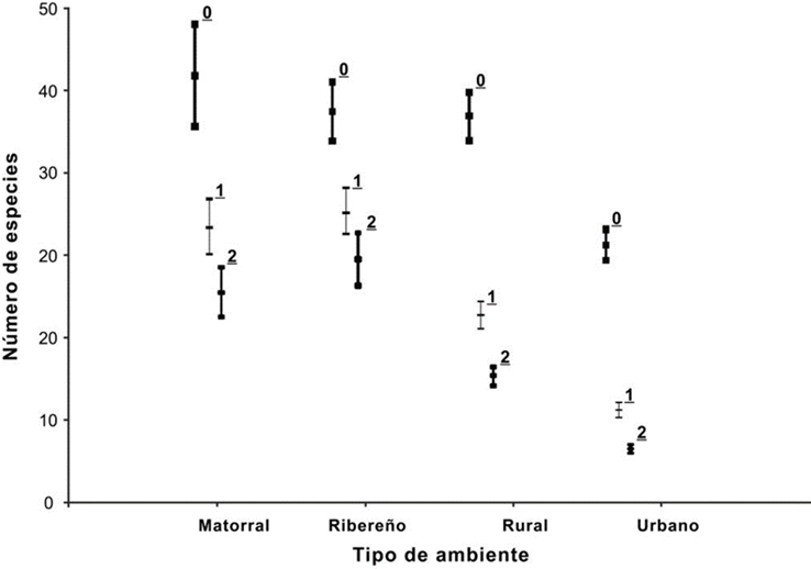 El cambio gradual detectado en la composición de especies y su abundancia por ambiente, coincidente con el gradiente de alteración antrópica matorral-ribereño-rural-urbano, sugiere que en general las especies tienen diferentes grados de tolerancia a la alteración del medio, como se ha observado en otros estudios (Fraterrigo y Wiens 2005). En este sentido resalta el que las especies exóticas mostraron una alta preferencia por los ambientes alterados rural y urbano, las especies endémicas por los ambientes poco alterados matorral y ribereño, y otras especies residentes y migratorias tuvieron mayores abundancias en el medio rural. El cambio gradual encontrado en la composición de especies también sugiere que las comunidades responden a factores ambientales muy locales, como ha sido observado para la riqueza y la abundancia de aves en diferentes tipos de urbanización en la Ciudad de México (Ortega-Álvarez y MacGregor-Fors 2009).