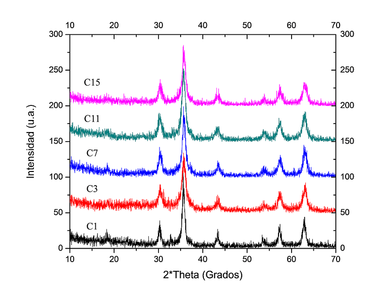 Para analizar el efecto de los parámetros operativos sobre el tamaño de partícula fue necesario analizar la estructura cristalina del producto obtenido, el cual se caracterizó a partir de XRD para identificar la fase de óxido de hierro presente. Los difractogramas obtenidos para muestras preparadas a diferentes condiciones se muestran en la Figura 1. Los datos muestran que los productos finales presentan patrones similares, y la estructura que se le asignó fue la magnetita (Fe3O4) (JCPDS No.00-001-1111). Además en la Tabla 4 se pueden observar que los valores de tamaño de partícula calculados a partir de XRD mediante la ecuación de Scherrer difieren de los valores calculados por TEM, esta ligera diferencia puede ser debida a algunas contribuciones tales como: tensión estructural, gradiente de composición, y distribución de tamaño [Tomaszewski (2012)].