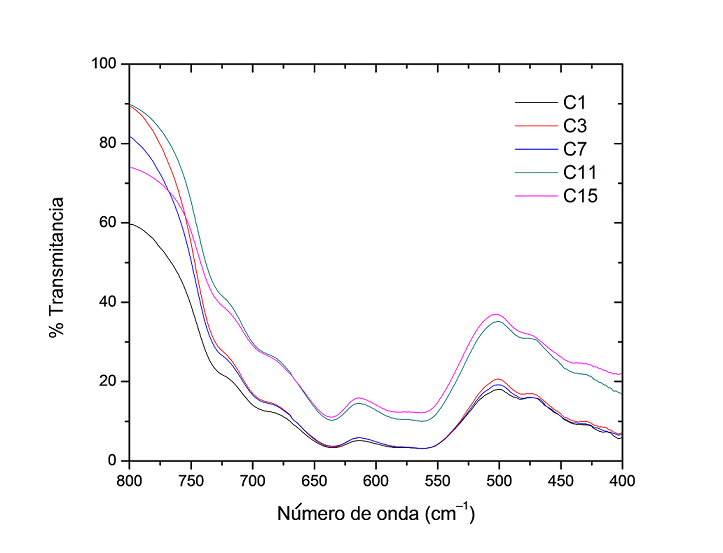 En la Figura 2 se muestran los espectros de IR en la región 400 a 1000 cm-1 para los distintos ensayos. Los espectros de IR muestran dos bandas de absorción; una centrada alrededor de 510 cm-1 y otra alrededor de 400 cm-1, estas vibraciones son las típicas del enlace Fe-O, lo cual da indicio de una transición de los átomos de hierro de la estructura cúbica centrada en las caras (Fd3m) en el cual no existe un ordenamiento en las vacantes, lo cual es consistente con los valores de magnetización, presentando valores bajos, así como en algunos casos, partículas de menor tamaño tienen una magnetización de saturación mayor que partículas de mayor tamaño.