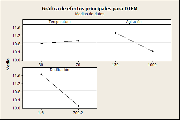 En la Figura 5 se muestra la gráfica de efectos principales, donde la temperatura tiene un efecto mínimo sobre el tamaño de partícula, debido a que presenta una pendiente pequeña y muy similar al valor medio del tamaño de partícula, por otro lado, el tamaño de partícula es mayor operando a una temperatura de 70 °C. Sin embargo, la agitación y la velocidad de dosificación son efectos que influyen de manera considerable sobre el tamaño de partícula, debido a que sus pendientes son muy pronunciadas, siendo ambas inversamente proporcionales al tamaño de partícula, es decir para obtener un mayor tamaño de partícula la velocidad debe ser baja, además el cambio de pH en la solución debe ser bajo.