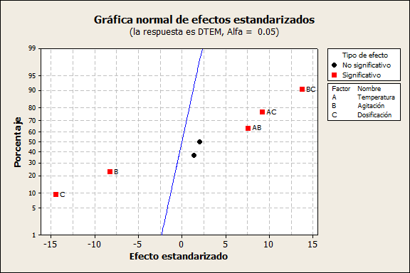 En la Figura 7 la gráfica normal de efectos estandarizados muestra que las mismas dos barras en el diagrama de Pareto corresponden a los dos puntos que se alejan de la línea en el papel normal, lo cual es indicio de un efecto real sobre el proceso. Los efectos restantes tienen un efecto sobre el tamaño de partícula, sin embargo, es menos significativo.