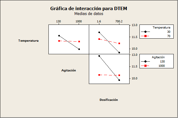 En el bloque I de la gráfica de interacción de la Figura 8 se presenta el efecto de la interacción de la temperatura con la velocidad de agitación y se observa un cruzamiento. Sin embargo, operando a una temperatura de 70 °C no existe un efecto importante. Por otro lado, operando a 30 °C se observa que el tamaño de partícula aumenta al disminuir la velocidad de agitación. En el bloque II de la Figura 8 se muestran las interacciones de la velocidad de dosificación del medio básico con la temperatura y se observa que operando a 70 °C y 30 °C existe un efecto sobre el tamaño de partícula, siendo mayor este cuando se opera a una velocidad de dosificación de 1.6 mL/min (nivel bajo). Es apreciable observar que existe un mayor efecto operando a 30 °C, ya que su pendiente es más pronunciada con respecto a una temperatura de 70 °C. En el bloque III de la Figura 8 se muestran las interacciones entre la velocidad de agitación y la velocidad de dosificación del medio básico, teniendo un mayor efecto a 130 rpm debido a que presenta un pendiente mayor. A 1000 rpm no existe variabilidad importante, debido a que es casi nula la pendiente que presenta. El máximo tamaño de partícula mayor se obtiene operando a un nivel bajo de dosificación y una agitación baja.