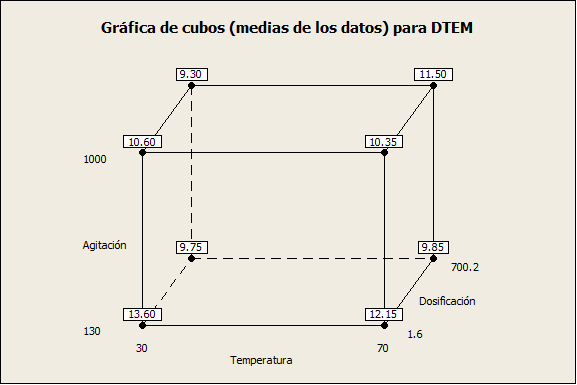 En la Figura 9 se muestra la gráfica de cubos, donde se reporta el rendimiento predicho por el modelo en cada combinación de los tres factores incluidos. En particular, en el mejor tratamiento se predice un tamaño de partícula de 13.6 nm, operando a una combinación de niveles (-, -, -) es decir; nivel bajo de agitación (130 rpm), dosificación del medio básico baja (1.6 mL/min) y temperatura de 30 °C, lo cual es consistente con la Figura 8.