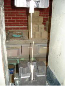 Se obtuvieron cilindros de bambú con y sin nudo en su altura media y se tomaron especímenes de longitud igual a 2 veces el diámetro exterior promedio, al momento de la prueba se utilizó un aditamento metálico (Imagen 7), el cual está dividido en cuartos, con caras opuestas para permitir el corte. Este aditamento se construyó con 2 placas de acero de 3/8” de espesor soportadas por varillas lisas con diámetro de 3/8” roscadas, con el propósito de inducir el corte en las probetas como puede observarse en las fallas presentadas (Imagen 8).
