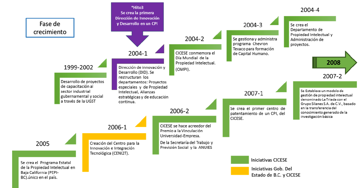 Durante el último semestre de 2003, se llevaron a cabo reuniones de trabajo en las divisiones de CICESE y en las direcciones de apoyo para alinear las estrategias de institucionales a lo que el CONACYT indicaba respecto al fortalecimiento del Sistema Nacional de Innovación, después de seis meses se hizo la reestructuración de la Dirección de Vinculación para dar paso hacia la Dirección de Innovación y Desarrollo (DID). Es entonces en el año de 2004, cuando se produce el tercer Hito, (Ver Figura 2), mediante el surgimiento de la primera Dirección de Innovación y Desarrollo de un CPI del CONACYT, llevándose a efecto una planeación estratégica (FODA) con objetivos y metas para el periodo 2004-2007, misma que cuenta con número de registro 03-2006-083011335800-01 en INDAUTOR (Serrano A., López Carlos G., Rubi E., Mendoza C., Armenta A., 2006) y con la reestructuración de sus departamentos quedando dos de ellos: a) Proyectos Especiales y Propiedad Intelectual, y b) Alianzas Estratégicas y Educación Continua.