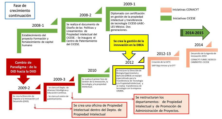 La discusión se centra en el marco de los cuatro Hitos identificados: el primero de ellos, el pasar de un proyecto de transferencia de tecnología al reto de consolidar dicho proyecto dentro de una función institucional, creando en 1991 la primera Dirección de Gestión Tecnológica del CICESE (DGT). El segundo Hito se refiere a la creación de la Dirección de Vinculación del CICESE (DV), que substituyó a la Dirección de Gestión Tecnológica con una estructura funcional formada por los departamentos de Educación Continua, Proyectos y Comunicación en 1997, el tercero Hito cuando la Dirección de Vinculación da pauta al surgimiento de la primera Dirección de Innovación y Desarrollo (DID) de un CPI en 2004; realizando así una reestructuración departamental y el cuarto mediante la creación del Departamento de Innovación Biomédica.