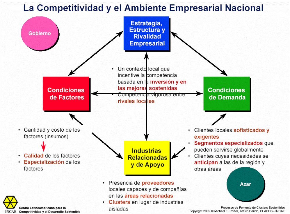 El Diamante de Porter (Figura 1) es un marco teórico conceptual en el que se analizan las ventajas competitivas de una cadena productiva y consta de cuatro partes: condiciones de los factores, condiciones de la demanda, empresas relacionadas horizontal y verticalmente y la estructura y rivalidad de las industrias. Todos estos atributos conforman un sistema, al cual Porter denominó "Diamante". Dos variables auxiliares complementan el marco del análisis: el gobierno y los hechos fortuitos o causales (Malakauskaite and Navickas, 2011). La base teórica que provee el Diamante de Porter (Porter, 1990) ha sido usada en diferentes partes del mundo para plantear políticas para el desarrollo de la competitividad de naciones o sectores como el caso de Centroamérica (Niels et al., 2015).