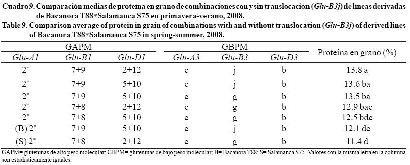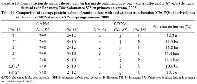En el Cuadro 9 y 10 se muestra la comparación de medias por combinación para proteína en grano y harina, respectivamente; donde se observan que las combinaciones 2*, 7+9, 2+12, c, j, b y 2*, 7+9, 5+10, c, j, b mostraron valores altos; sin embargo, combinaciones sin translocación se asociaron a porcentajes estadísticamente iguales, resultados similares fueron reportados por Kim et al. (2005). Por otro lado, la combinación de Salamanca S75 sin el alelo Glu-B3j, se asocio al valor más bajo de proteína, esto último no se asemeja con lo reportado por Amiour et al. (2002).