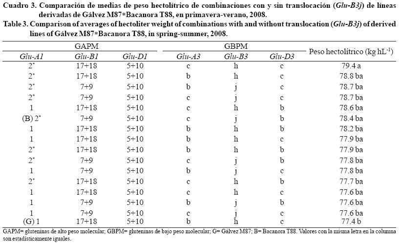 La translocación 1BL.1RS se identificó en 7 combinaciones diferentes de GAPM y GBPM, en la cruza Gálvez M87Bacanora T88. En el Cuadro 3 se muestra la comparación de medias para peso hectolítrico de la progenie agrupada por combinaciones de GAPM y GBPM, se observan que dos combinaciones recombinantes 2*, 17+18, 5+10, c, h, c y 2*, 17+18, 5+10, b, h, c sin translocación (únicamente difieren en el alelo locus Glu-A3), mostraron valores altos de peso hectolítrico; sin embargo, no fue estadísticamente diferente a dos combinaciones que mostraron el alelo Glu-B3j, que indica la presencia de proteínas secalinas. Por otro lado los valores bajos se asociaron a combinaciones translocadas que presentan el alelo Glu-B3j o la translocación 1BL.1RS, además del progenitor Gálvez M87. Lo anterior contradice lo afirmado por Villareal et al. (1998) y Lelley et al. (2004) quienes encontraron que genotipos con 1BL.1RS favorecieron la densidad del grano.