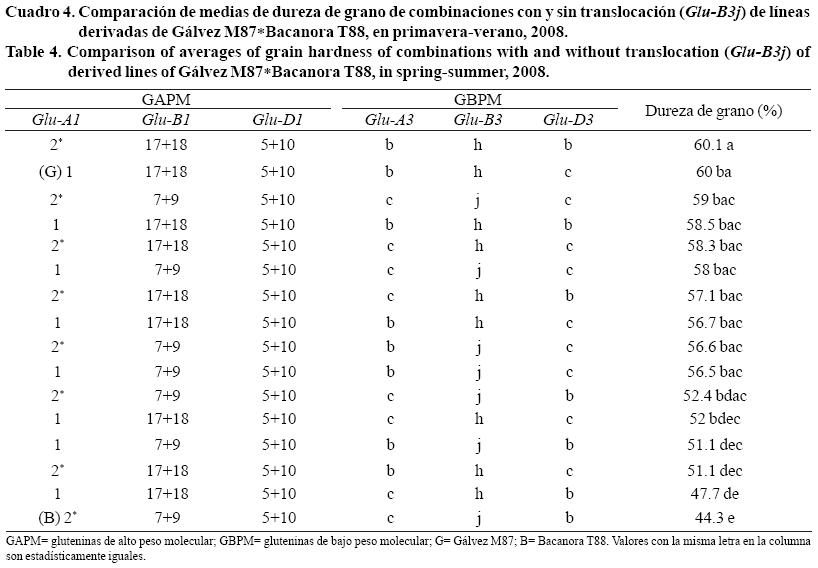 La comparación de medias para dureza de grano de las combinaciones derivadas de Gálvez M87Bacanora T88 se presentan en el Cuadro 4. Se generaron combinaciones recombinantes que se clasifican de endospermo semi-suave a duro. Esta variación de la progenie se debe que ambos progenitores son totalmente contrastantes en este carácter; es decir, Gálvez M87 se clasifica con textura de grano semi-suave y Bacanora T88 como duro.