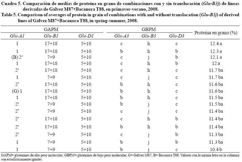 En el Cuadro 5 y 6 se presenta la comparación de medias por combinación para el contenido de proteína en grano y harina, respectivamente; donde se observaron combinaciones con y sin translocación asociadas a los valores más altos de proteína, que no concuerda con lo afirmado por Amiour et al. (2002), Dvořáček et al. (2006), Nishio et al. (2007) y Gobaa et al. (2008), quienes reportaron que genotipos que presentan el brazo corto (1R) del centeno, mostraron valores altos de contenido de proteína; además fueron tres combinaciones asociadas al alelo Glu-B3j los que se asociaron a valores bajos de proteína; que tampoco coinciden con Bullrich et al. (1998), Martin y Carrillo (1999) y Kim et al. (2005) quienes no encontraron diferencias entre genotipos con y sin 1BL.1RS, para contenido de proteína en grano.