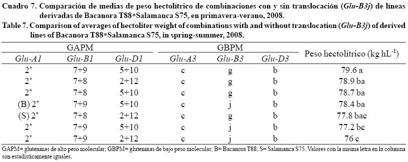 La translocación 1BL.1RS se identificó en tres combinaciones diferentes de GAPM y GBPM en la cruza Bacanora T88Salamanca S75. La comparación de medias por combinación para peso hectolítrico se muestran en el Cuadro 7. Donde se observa que valores altos, corresponden a combinaciones recombinantes sin la translocación; mientras que valores bajos presentaron las combinaciones 2*, 7+9, 5+10, c, j, b y 2*, 7+9, 2+12, (asociadas al alelo Glu-B3j), lo cual no concuerda con Villareal et al. (1998) y Lelley et al. (2004), quienes reportaron que genotipos con la translocación 1R aumentaron el peso hectolítrico.