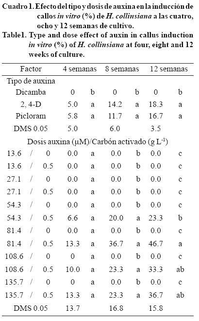 En el presente estudio el 2,4-D fue la mejor auxina para la inducción de callo en secciones transversales basales de pseudotallo de plántulas in vitro de H. collinsiana combinado con carbón activado (0.5 g L-1) superando al picloram y dicamba. Ello se debe a que esta auxina se considera una molécula de señalización que juega un papel importante en la reactivación del ciclo celular y la división en células diferenciadas indispensables para la iniciación de los procesos del desarrollo. Esta reactivación del ciclo celular se alcanza por la expresión de ciertos genes de respuesta a auxina (Karami y Saidi, 2010).