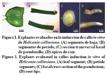 A partir de plántulas asépticas desarrolladas in vitro de H. collinsiana se obtuvieron explantes de hoja, pecíolo, ápices de raíz y secciones transversales [thin cell layer (capas finas de células)] de la base del pseudotallo. Para los explantes de hojas se cortaron segmentos de 1 cm2 de la lámina central con la nervadura principal mientras que de los pecíolos se usaron secciones longitudinales de 1 cm. En los explantes de raíz se obtuvieron secciones longitudinales de 1 cm incluyendo el ápice. Para obtener las secciones transversales de pseudotallo se cortaron segmentos basales de plántulas de 10 mm de diámetro con 1-2 mm de grosor (Figura 1).