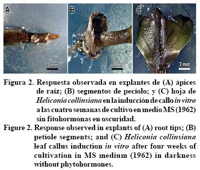En el presente estudio fue factible inducir la formación de callos in vitro en explantes de secciones transversales basales de pseudotallo de Heliconia collinsiana cultivados en medio MS (1962) adicionado con 2,4-D (81.4 μM) y picloram (135.7 μM) combinado con 0.5 g L-1 de carbón activado durante 12 semanas en oscuridad. Con estas concentraciones hormonales se obtuvieron 100% y 90% de inducción, respectivamente. En la etapa de proliferación, los callos generados con 81.4 M de 2, 4-D continuaron su crecimiento cuando se subcultivaron en medio MS (1962) suplementado con 4.5 y 9 μM de 2, 4-D a las 16 semanas en fotoperiodo de 16 h. Los explantes de ápices de raíz, segmentos hoja y pecíolo fueron incapaces de generar callos en ninguno de los tratamientos probados.