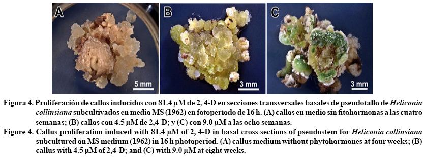 Si bien, en la mayoría de los protocolos en los que las auxinas actúan como un inductor eficaz de los callos, su proliferación se logra con la reducción o eliminación de la auxina del medio de cultivo. En los callos de heliconia no se observó este comportamiento. En algunas especies de plantas se requieren de las auxinas para continuar la proliferación de los callos (Jiménez y Thomas, 2005) y este fue el comportamiento observado en los callos de Heliconia collinsiana, donde la eliminación del 2, 4-D del medio de cultivo provocó el ennegrecimiento de los callos.