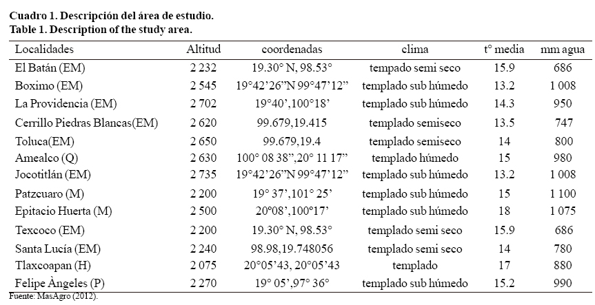 Los experimentos se establecieron en punta de riego en primavera-verano de 2011 en las siguientes 13 localidades del Estado de México (EM), Michoacán (M), Querétaro (Q), Hidalgo (H) y Puebla (P): Batán (EM: fechas 1 y 2), Boximo (EM), La Providencia (EM), El Cerrillo Piedras Blancas (EM: fechas 1 y 2) Toluca (EM: fechas 1 y 2), Amealco (Q: fechas 1 y 2), Texcoco (EM), Santa Lucía (EM), Jocotitlán (EM), Patzcuaro (M), Epitacio Huerta (M), Tlaxcoapan (H) y Felipe Ángeles (P). La elección de estas localidades se realizó considerando sus diferencias en ubicación geográfica, altitud, clima y precipitación, principalmente (Cuadro 1).