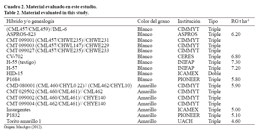 Los 17 híbridos utilizados fueron elegidos por la Red de Evaluación del Programa Modernización Sustentable de la Agricultura Tradicional (MasAgro). Este material experimental, pre comercial y comercial representa una opción viable para los Valles Altos del centro de México por su potencial de rendimiento y su adaptabilidad a esta región (Cuadro 2).