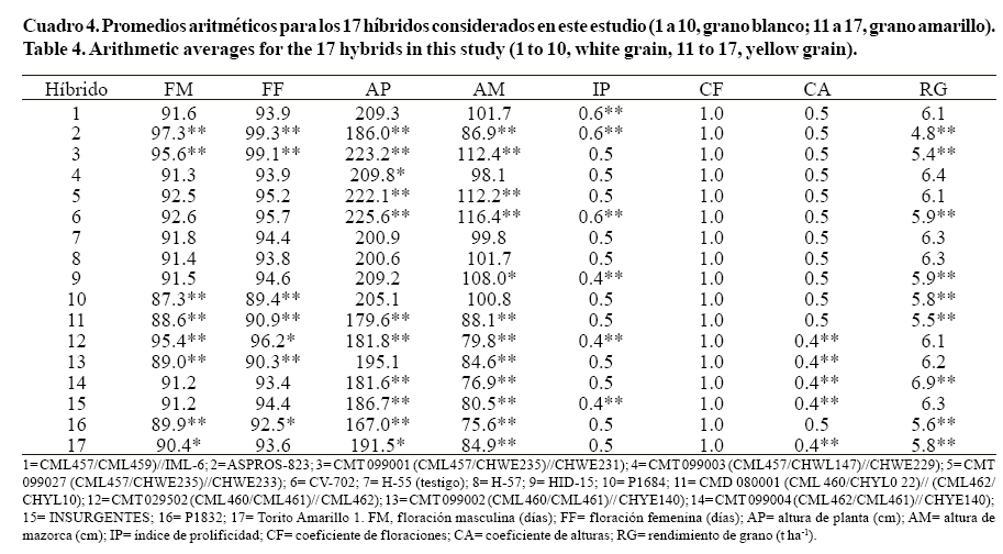 Los promedios aritméticos que se muestran en el Cuadro 4 sugieren que este material genético tiene características agronómicas deseables para establecer un sistema de producción intensivo. Los coeficientes de alturas (entre 0.4 y 0.5), y de floraciones (de 1), así como las alturas de planta (de 1.67 a 2.25 m) y de mazorca (de 0.75 a 1.16 m) que se registraron garantizan menores porcentajes de acame de tallo y raíz, muy común en las razas de Valles Altos como Cónico, Chalqueño, Cacahuacintle y Palomero Toluqueño (González et al., 2007; González et al., 2008). Éstas ventajas podrían aprovecharse para la siembra comercial de híbridos en altas densidades de población (hasta 100 000 plantas ha-1) y con mayores dosis de nitrógeno (hasta 300 kg ha-1) con el propósito de incrementar el RG. Los 17 híbridos también podrían clasificarse como material de ciclo intermedio con base en FM (de 87 a 97 días) y FF (de 89.4 a 99 días); esta característica es muy deseable para evitar daños por heladas tempranas o tardías en esta región del centro de México.