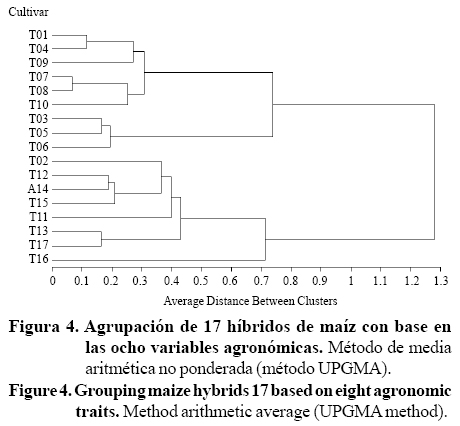 Con base en las ocho variables registradas en el presente estudio, en la Figura 2, si se corta el dendograma a una distancia promedio de 0.60, se observan cinco grupos: en G1 se detectó a Batán (fecha 1) y Cerrillo Piedras Blancas (fecha 2); G3 agrupó a Batán (fecha 2) y Santa Lucía; en G4 se clasificó a Jocotitlán; en G5 se identificó a Tlaxcoapan; en G2 están el resto de los ambientes. El mayor RG (8.64 t), las mayores dimensiones de la planta (AP, 2.62 m) y de la mazorca (AM, 1.40 m) y el menor ciclo vegetativo (78.8 y 79.7 días a FM y FF) se identificaron en G5. Los grupos 3 y 4 sólo difirieron en FM, FF y AM (103.65, 109.59 y 0.74 m para G4); ambos grupos tuvieron un RG similar al del grupo 2 (5.36 t) pero éste último presentó mayores dimensiones de planta y mazorca (1.97 y 0.90 m) y ciclo vegetativo intermedio (93.3 y 95.9 días a FM y FF; Cuadro 3).
