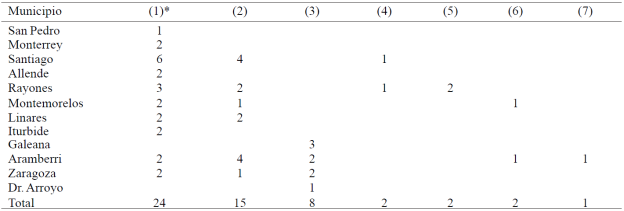 Se determinaron 54 sitios con presencia de una o más especies, en donde se recolectaron muestras de semilla y se identificaron siete especies de Phaseolus. La distribución de especies silvestres en Nuevo León ha estado restringida en las estribaciones montañosas de la región de la Sierra Madre Oriental de México, en los municipios de San Pedro, Monterrey, Santiago, Allende, Montemorelos, Rayones, Linares, Galeana, Iturbide, Aramberri, Zaragoza y Dr. Arroyo (Cuadro 1), en donde la mayor diversidad se ha encontrado en Aramberri (cinco especies), Rayones (cuatro especies), Santiago, Montemorelos y Zaragoza (tres especies).