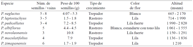 En segundo lugar estuvo P. leptostachyus, recolectada desde los 1 990 msnm en el municipio de Santiago, hasta los 714 msnm en el municipio de Monterrey (Cuadro 2). Esta especie se observó con alguna frecuencia en las partes intermedias y altas de la región de la Sierra Madre Oriental de México, principalmente en ambientes abiertos de vegetación arbórea, entre bosques de pino y encino, ya que es una especie de crecimiento indeterminado tipo rastrero, que próspera bien en sitios perturbados pero que estén protegidos de factores que representen amenazas para su crecimiento y desarrollo. Estos resultados concuerdan con los obtenidos por Lépiz et al. (2004a y 2004b) en la región de los ríos Verde y Santiago en el estado de Nayarit.