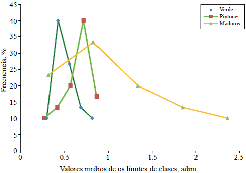 The results from the measurements of the physic-mechanical properties (PFM) under study were statistically processed by the Statical Analys System (SAS) version 8.0, Statgraphics Plus version 5.1 and Microsoft Excel version 2010, obtaining for each PFM determined experimentally in the three stages of maturation mean values (x), standard error ofthe mean (e), standard deviation (o) and coefficient of variation (cv); also variational distribution curves were constructed. Additionally a Tukey test was performed to detect significant differences between mean values of each property in the three stages of ripening. Table 1, shows the results of analysis of variance for different properties under study according to stage of ripening.