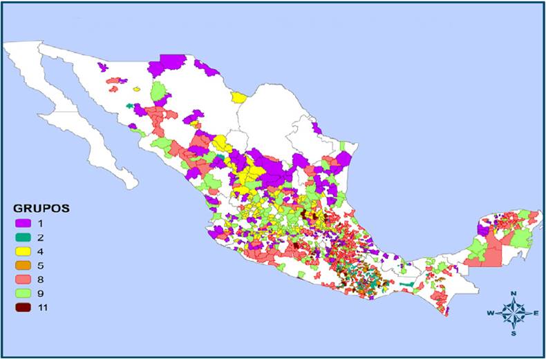 In this sense, group 8, which comprises 17.7% of the municipalities, has a MI mean of (-.04) m and the majority of the group belongs to the state of Puebla, with a lower presence in the states of Oaxaca, Yucatán and Michoacán. Group 7 agglomerates a total of 327 municipalities and this group has a MII value of (-.31); they have a low migration level as well as an MI value of (-0.90). The municipalities that comprise this group are mainly in the states of Chihuahua, Jalisco, State of Mexico, Sonora, Veracruz and Yucatán.