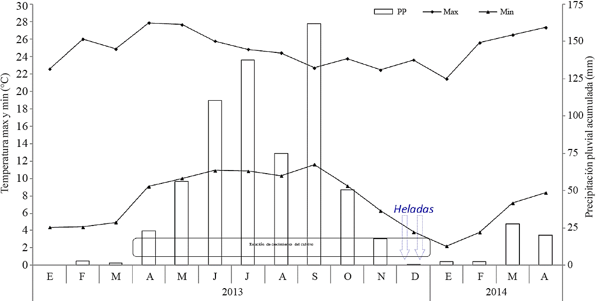 El experimento se desarrolló en el periodo abril-diciembre de 2013 en el Campo Experimental del Colegio de Postgraduados, localizado en Montecillo, Texcoco, Estado de México, con coordenadas geográficas 19° 28’ 02.9’’ de latitud norte y 98° 54’02.3’’ de longitud oeste y una altitud de 2 240 msnm. El clima de acuerdo a la clasificación climática de Köppen modificada por García (2005) es C (Wo) (W) b (i´), correspondiente al clima templado subhúmedo con lluvias en verano. La precipitación y la temperatura media anual son de 625 mm y 16 °C respectivamente. La precipitación del año del experimento inicio en abril y duró a mediados de octubre con un régimen bimodal, con sequia intraestival (SI) en el mes de agosto y la gran sequía invernal (GSI) de mediados de octubre hasta mediados de marzo. La precipitación acumulada durante la estación de crecimiento del cultivo fue de 639 mm (Figura 1). Se presentaron heladas de inicios de diciembre a mediados de febrero (Figura 2). Los datos de las variables meteorológicas se obtuvieron de las estaciones ubicadas en el Colegio de Postgraduados y de la Universidad Autónoma Chapingo.
