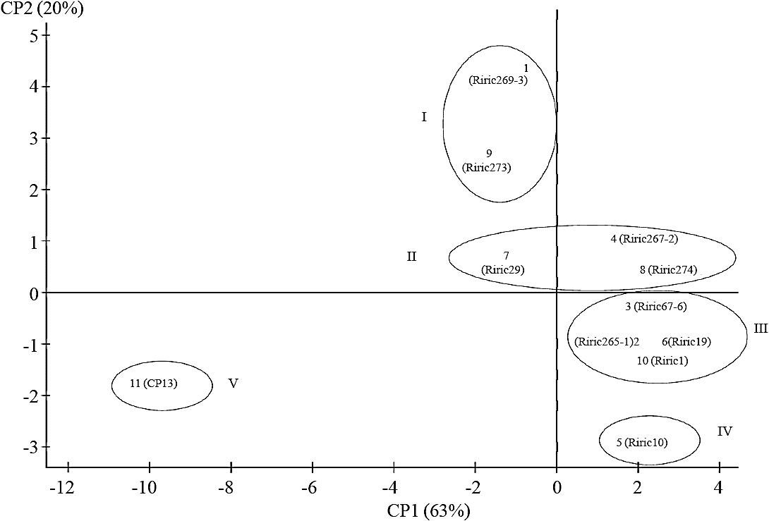 Las variedades que tuvieron las mayores frecuencias en los índices de selección: V6 (Riric19), V2 (Riric 265-1) y V10 (Riric1) se conglomeraron en el grupo III del ACP con la diferencia que en las componentes principales las variables están confundidas y en los índices están explicitas (Figura 3).