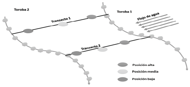 Sampling design. The experiment was conducted following a randomized block design; for this, a transect perpendicular to the arrangement of the torobas was established and six points were taken in the direction of the transect (Figure 2). Each site was evaluated separately and within them, the treatments were arranged in factorial form, where the use of antierosivo device (toroba and natural forest) and the position toroba (high, medium and low) was evaluated. Each position was considered in the two transects and two conditions were evaluated sites (toroba and forest), for six treatments for each sampling site (Mide and Zamurito) for a total of 12 experimental units.